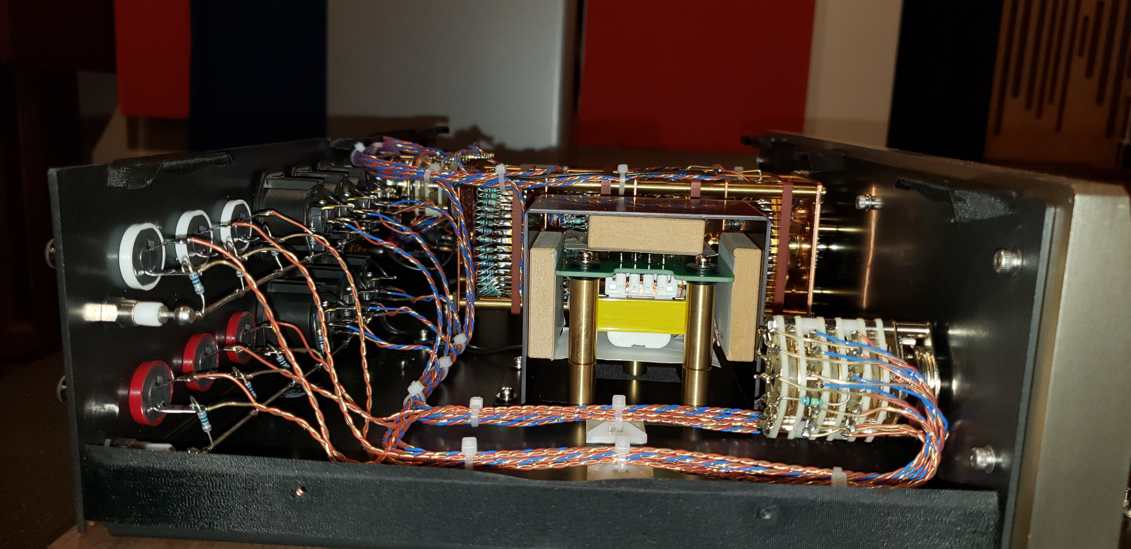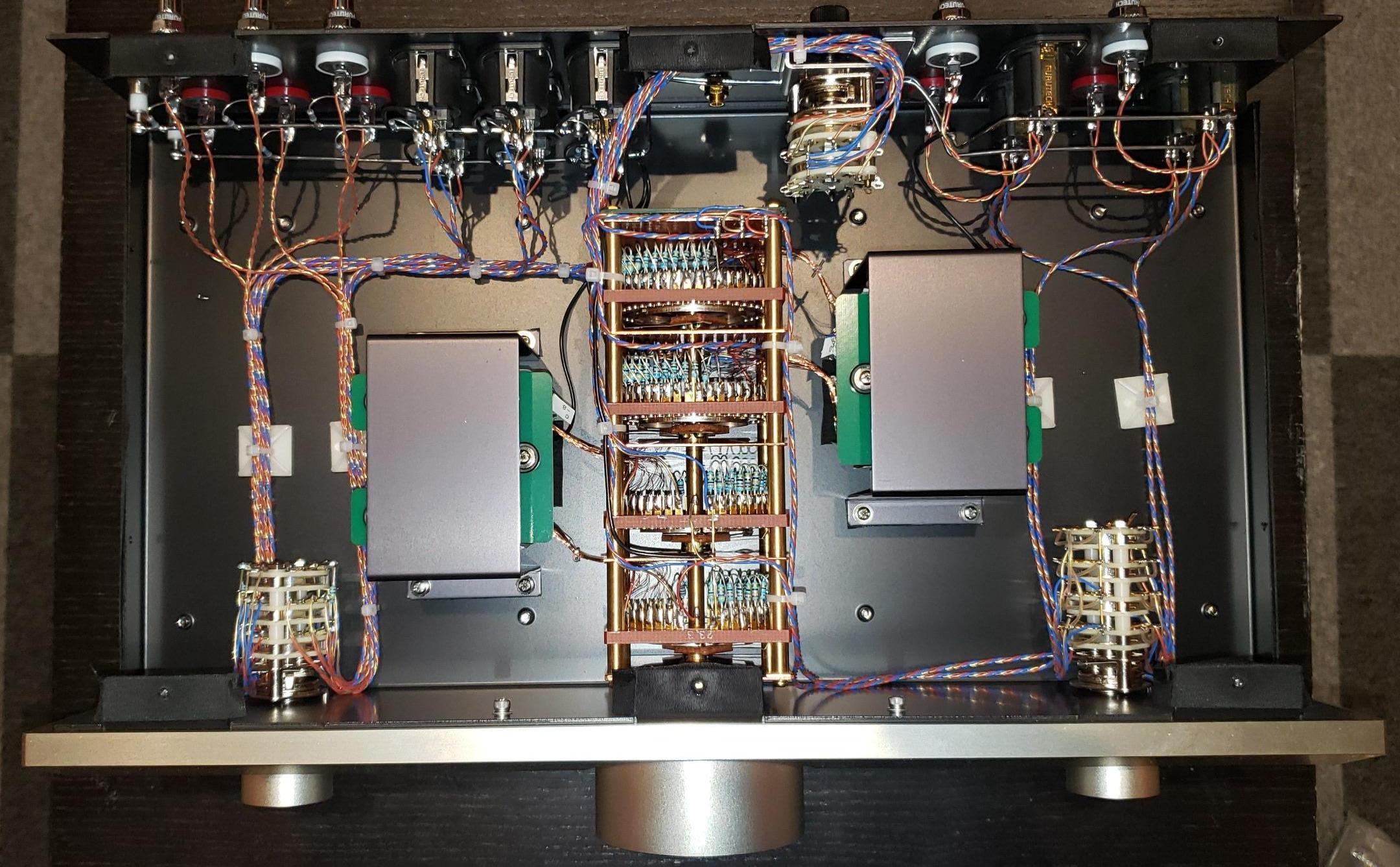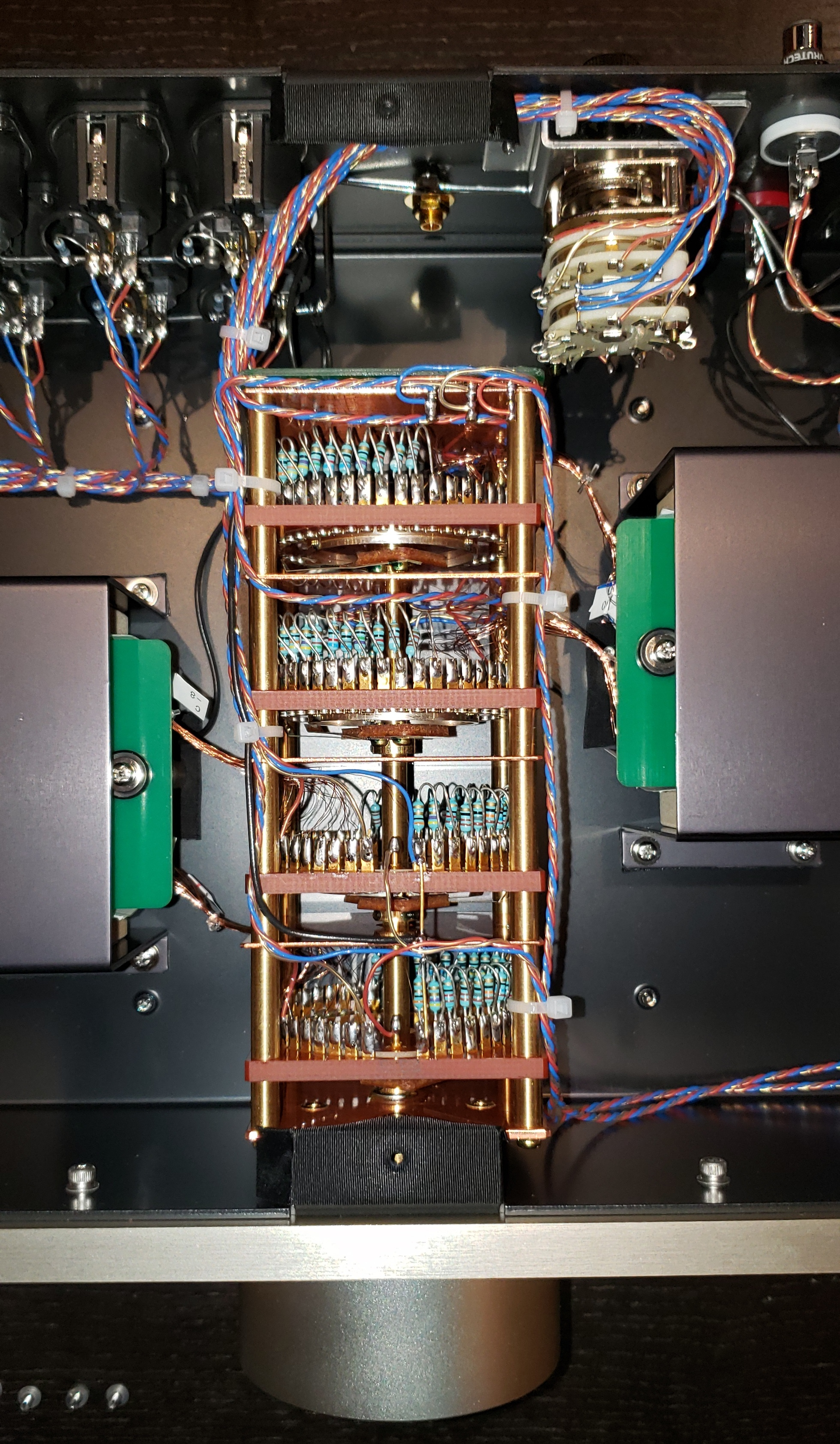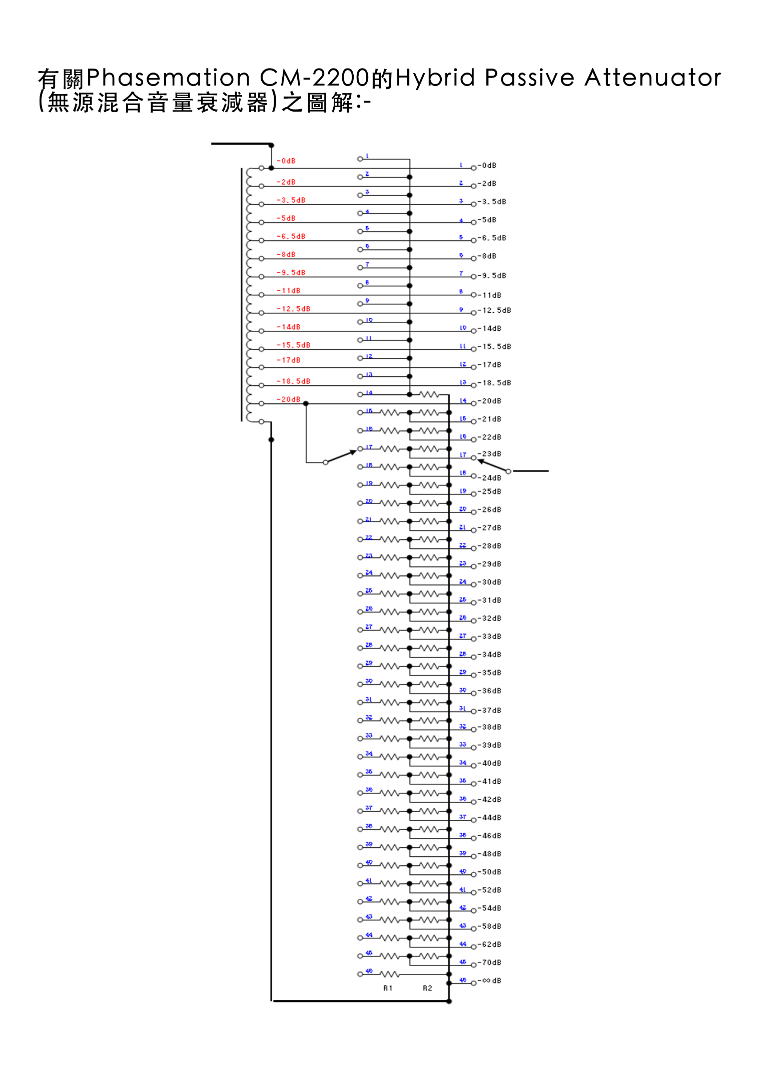 -20dB之後的14級就經過火牛線圈作多組不同電平「抽頭」輸出,焊接到衰減器-20dB後的尾14級段上,結合步進電阻和單用火牛分組「抽頭」這兩種混合方式,這類極複雜的音量衰減器設計,需要極精密的火牛繞線製作,和只能以熟練的技工,以全人手焊接及校對,才能保證前級每個部位的準確和穩定性。此外,CM-2200是全平衡線路處理關係,因此音量衰減器的46級,無論是電阻又或者火牛「抽頭」都分成左及右聲道冷/熱極共4組焊接。