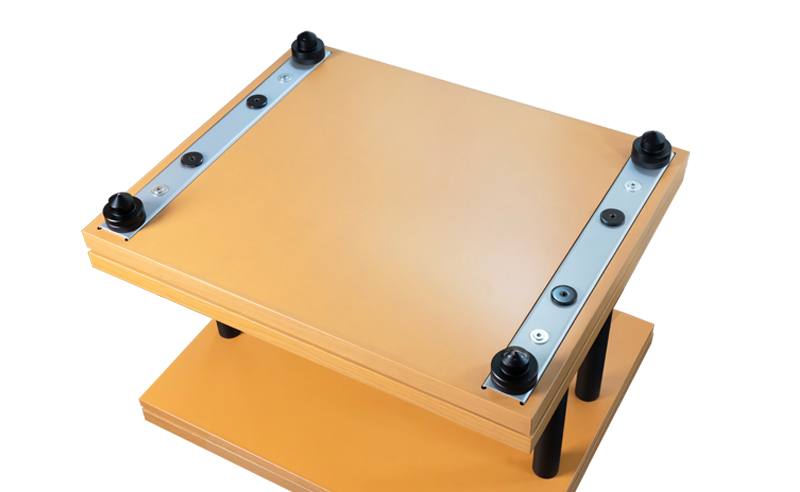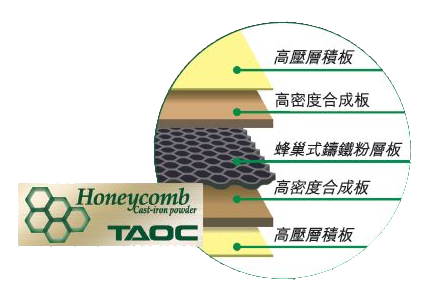 每層的板塊是由兩塊獨立承板組成,頂板與底板之間設有四枚釘墊隔離,而承板亦轉用廠方最新研發的五層三明治式Honeycomb板,Honeycomb主要在兩塊MDF板之間加入全新開發的鑄鐵粉末