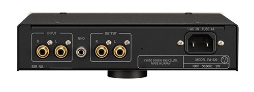 EA-220唱放擁有兩組輸入,可在面板切換MM或MC唱頭放大,帶來更大的靈活性,而且適合有機會想使用兩枚MC唱頭的用家。唱放的輸入能做到MM:2.5mV和MC: 0.12mV這極高水平的靈敏度,因此,增益只需設置在MM為38dB,MC63dB已能滿足大部份入門、甚至萬圓級的唱頭要求。廠方更特別為EA-220唱放設計及訂造的避震底腳,有效抑制諧震,加上選用IEC式電源插座,讓發燒友可隨意更換電源線升級。
