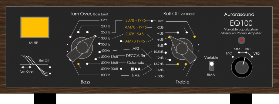 大家要明白,單聲道唱片是較古舊的產物,現時以四、五十年代出品最為盛行,而當時的的製作是未有像立體聲唱片一樣以RIAA曲線作為還原標準,因此,不少錄音曲線是以唱片公司自己釐定,又或者是錄音協會所提倡的還原曲線。為了迎合播放單聲道唱片這種特殊需求,廠方將EQ-100的等化曲線部份分成兩大方向來給用家調節。分別是中/低頻範圍Turnover「周轉」的曲線移位,從0dB開始,然後到200Hz, 250Hz, 300Hz, 350Hz, 400Hz, 500Hz/12dB, 500Hz/16dB, (300Hz/20dB即是RIAA標準)和800Hz,一共10個頻點周轉調整。而另一個是從10kHz開始的高頻滾降值調控,亦是從0dB開始,之後是-2dB, -4dB, -6dB, -8dB, -10.5dB, -12dB, (-13.7dB即是RIAA標準),接下來是-16dB和-18dB,總共一樣有10段不同程度的滾降曲線可供調節。從這兩大範圍音頻曲線調校中,除RIAA曲線外,還有其它唱片品牌,與及不少錄音組織的單聲道曲線;包括Decca ffrr(迪加唱片公司),Columbia(哥倫比亞唱的公司),AES及NAB兩大錄音協會的制定。另外,亦有1945年之前的美國和歐洲版78轉SP唱片,與及1945年之後的美/歐版78轉SP唱片曲線,總共10條。上述的曲線位置,都清楚地刻印在旋鈕兩旁的面板上,使用時甚為方便。