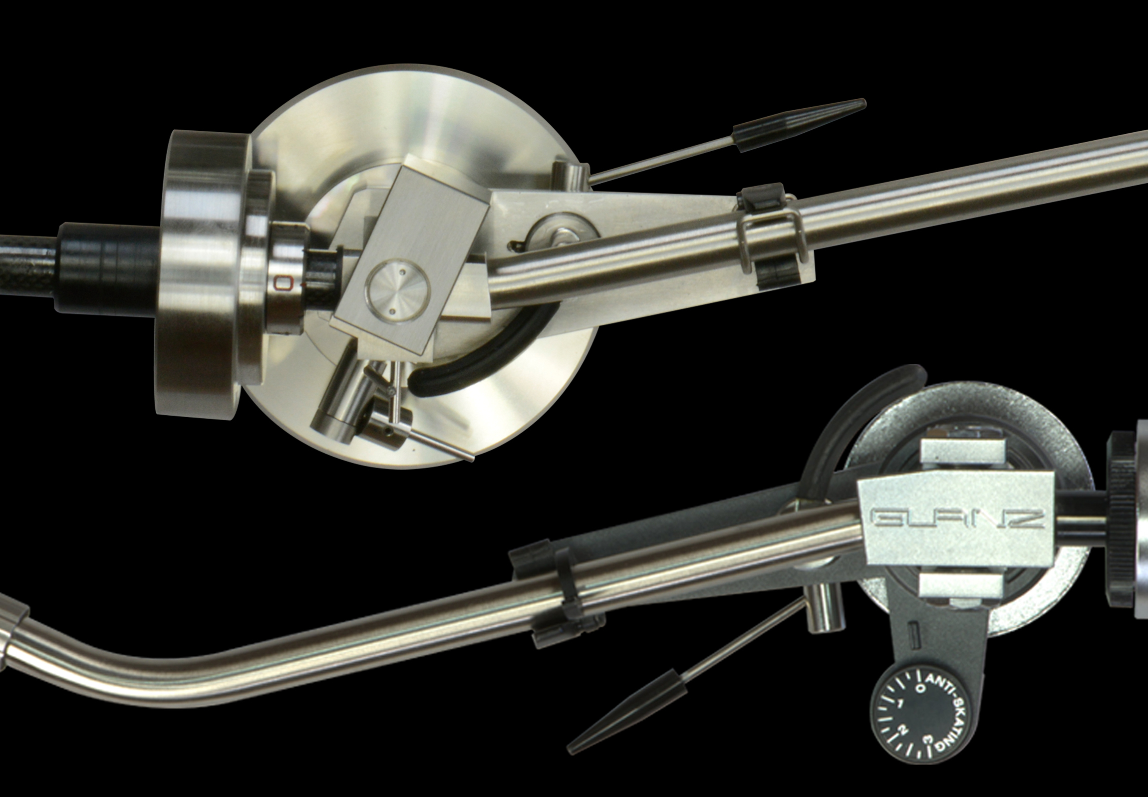 2. “要有最好的辦法把唱臂諧震抑制”。這可說是Glanz的唱臂強項。它使用不鏽鋼作為唱臂的基礎物料,因為不鏽鋼在裁切和接駁位比其它物料精準得多,質重和硬度也優勝過其它金屬。所以Stainless Steel 304實屬Glanz唱臂的必然之選。此外,唱臂承軸也是最脆弱、最容易引起諧震的零件。所以Glanz特別選用止推承軸(Thurst Bearing),讓承軸擁有足夠的滑動力,應付剛性高於鋁或碳纖製的鋼臂管,令循跡力和防震處理都比一般的承軸為更佳。