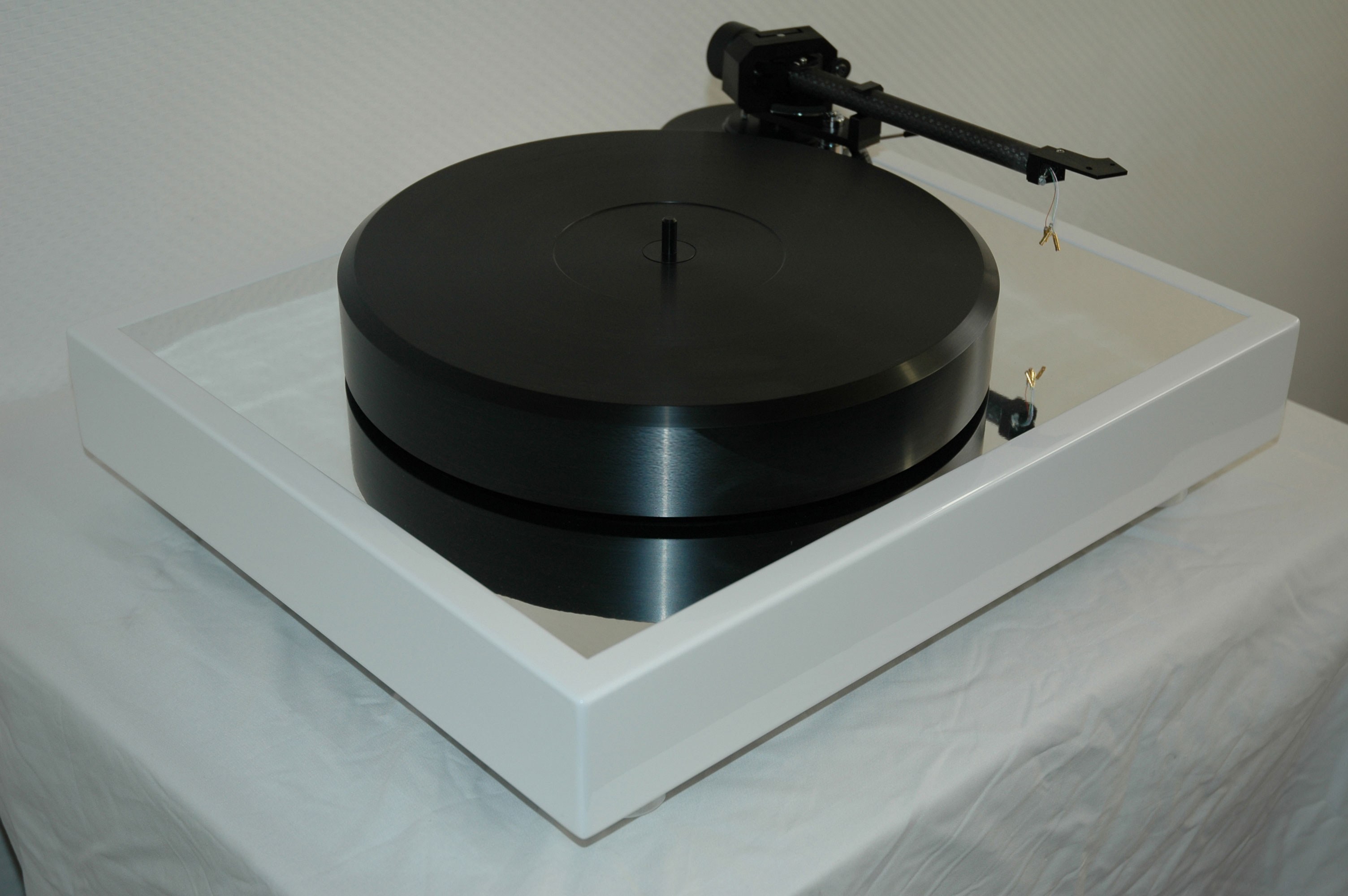 其次,plinth外框是20mmMDF製造,平面位置則是一幅碳纖維,其餘還有platter轉盤(重6公斤)、圓形臂板座和三個以一粒鋼珠為接觸點盤底腳座,全部均以delrin裁切製而成。外置式18VDC變壓器供電,附件中還包括六個大小厚薄不一的黃銅圓柱。平台的臂板對角設有兩支螺絲桿,作用是在安裝步驟上先要把唱臂和臂板一起安好在平台上,然後加入適當重量的黃銅圓柱,再用水平儀仔細量度平台,若還有差池,平台底部還有三組「倒V型」彈簧片可作微調來校正水平,務求讓唱臂和臂板在平台上獲得最佳水平。