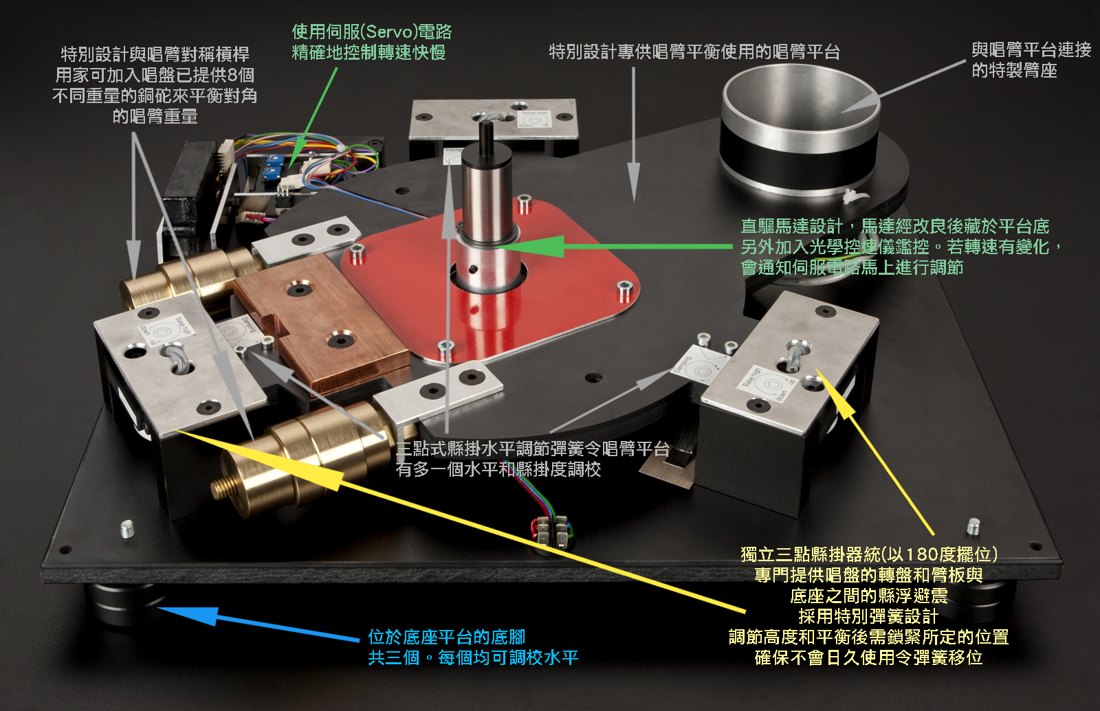 唱盤使用的直驅馬達及三個彈簧結構都是比較特別。由於馬達是廠方預先安裝,放在倒向式承軸圓柱下方,這個部份是打不開的,只可從副座側邊窺視,見一個體積細小的金屬盒裝載著。根據廠方資料,此乃是帶動馬達10份之1扭力的超級馬達(旋轉時手指輕按,轉盤便立即停頓下來),由於扭力減少,馬達轉動噪音亦同時銳減,抑制了直驅的諧震問題。整個馬達,由電路設計到轉軸繞線圈,全部工序在自己廠房裡進行。至於控速方面,它利用光學測速方式,當轉速有偏差,就會經Servo伺服電路作出即時修正,令轉速超級精準,而且獲得超低的Wow/Flutter抖擺。