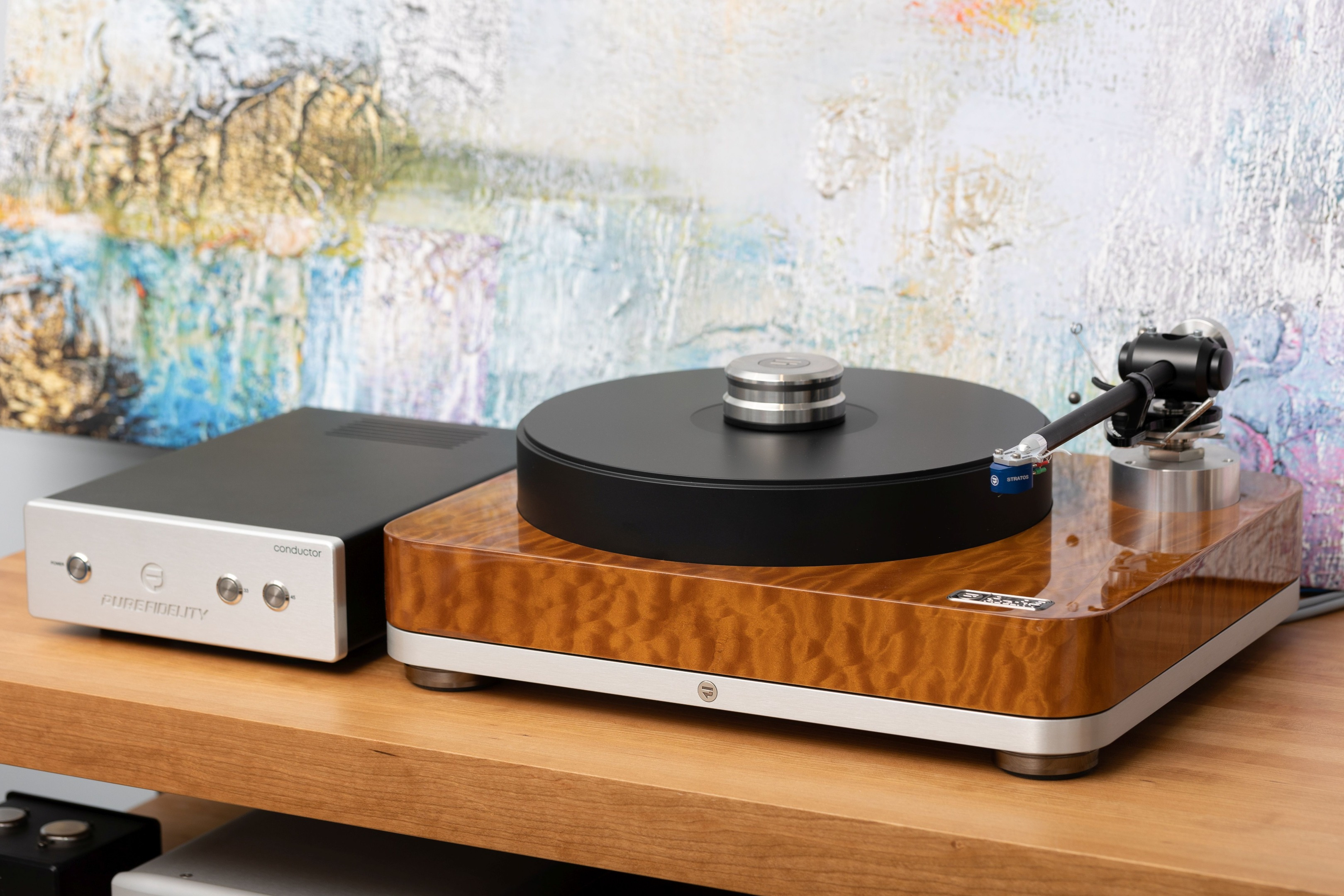 Pure Fidelity的唱盤設計另一重點是準確和穩定的轉速率。John選擇容易維持轉速的正常尺寸轉盤Platter,而卻不考慮慣性強,但容易產生轉速不穩的大型轉盤。所以每款唱盤的platter,廠方選用杜邦化工發明的賽鋼Delrin道種既堅硬又防震物料製造,配合AC馬達,特製滑輪、雙膠帶帶動、鋁合金副轉盤Sub-Platter和石英鎖控速Quartz Locked Speed Controller,讓每個Pure Fidelity的唱盤達致大師級表現。