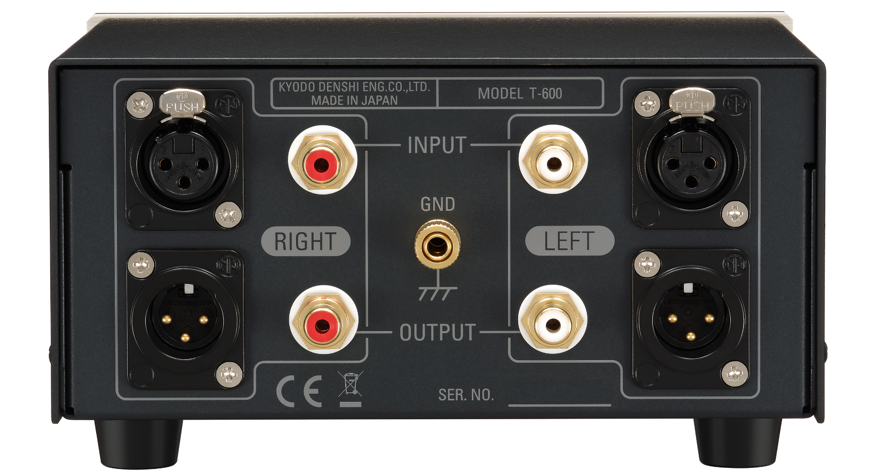 升壓牛接線方式為平衡設計,所以除RCA輸入/輸出各一組外,亦增設了XLR平衡輸入和輸出各一組,XLR插座採用德國Neutrik鍍金製品,確保能維持高品質的訊號傳送。另外,T-600面板上加入一個設換旋鈕,讓用家可使用兩個唱頭訊號以RCA及XLR連接到T-600,再經過此旋鈕選擇使用,甚為方便。這個旋鈕還可選擇”Pass”,令輸入訊號旁路,而直出到唱放,方面發燒友以T-600增益與唱放本身的前端放大作A/B比較。